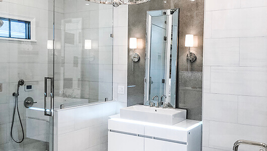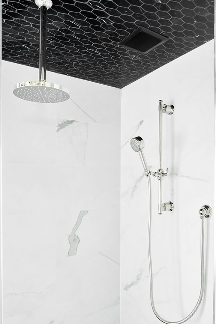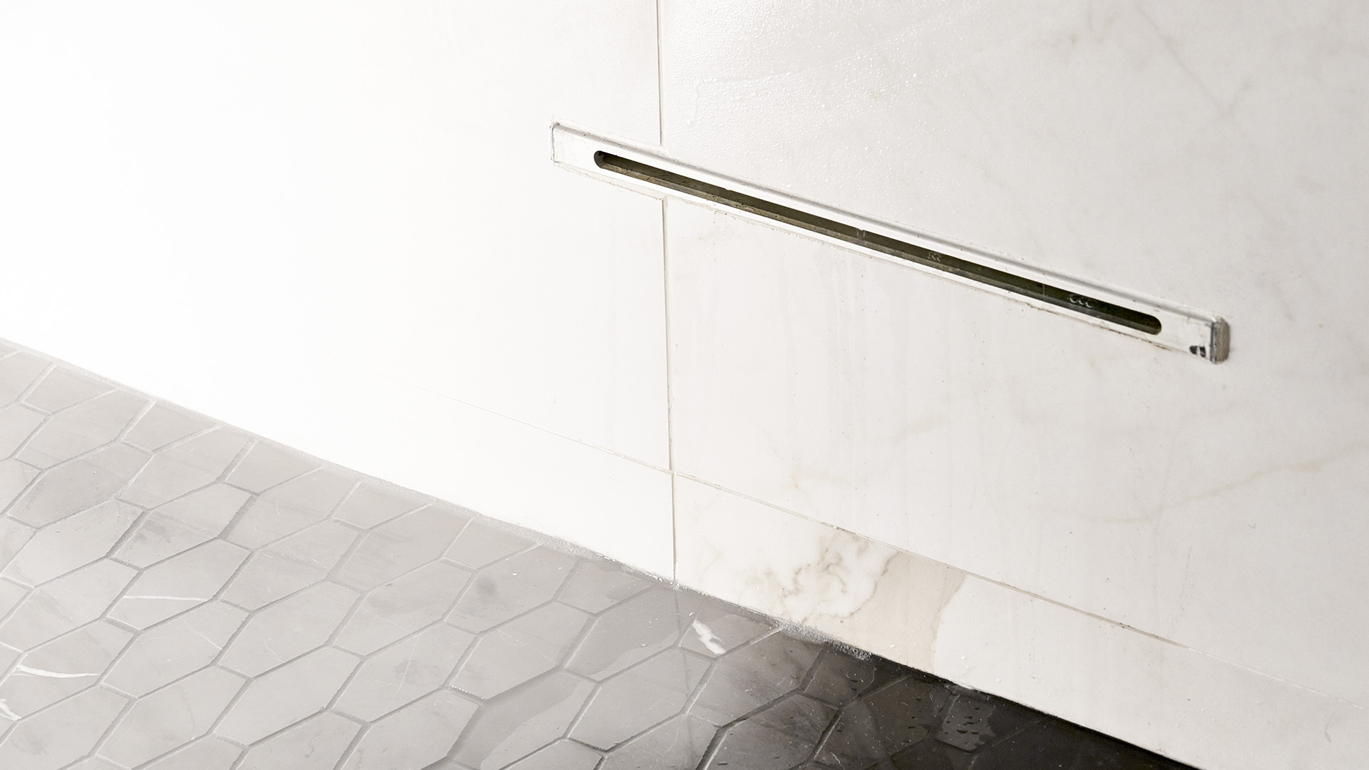 When Denise staged the bathroom reveal for Scott, the centerpiece of her surprise was the MrSteam steam shower, complete with the patent-pending Linear Steamhead, Music Therapy in-shower speakers and sound system, and aromatherapy to help combat Scott’s recurrent allergies and provide soothing lavender for them both to decompress after a busy day at work. Their old shower had always been chilly, so Scott used to turn on the water to heat the shower stall before entering. Now he can use the SteamLinx application on his mobile phone to dial up steam before he even enters the bathroom.