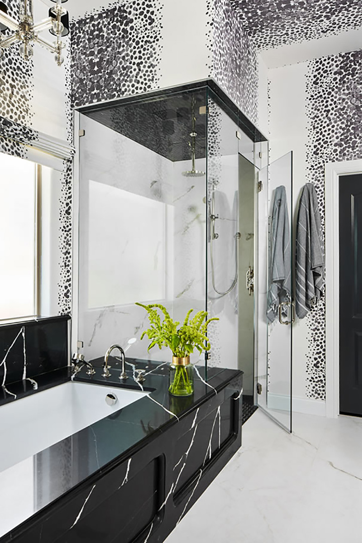 Denise made the space both colorful and sophisticated through an inviting black, white, and pink palette. She added texture and pattern through evocative artwork on the walls. Storage was vastly improved with deep drawers in the new vanities, while lighting was strategically placed over the sink, bright enough for shaving and make-up. Dimmer switches were provided to lower the light levels when the couple wanted a softer glow to luxuriate in some of the special amenities Denise installed.