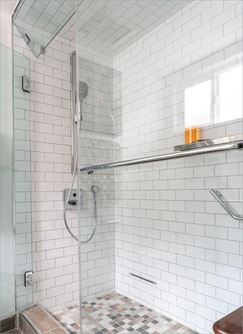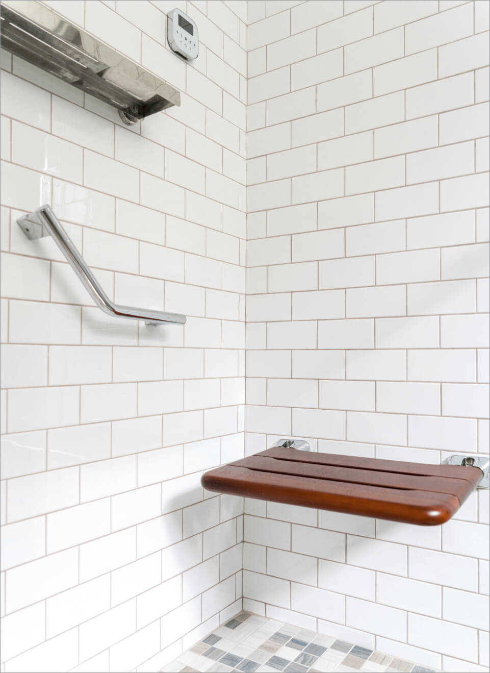She decided on a transitional design for her remodeled tiny space, which included classic subway white tile with taupe grout, and a neutral colored tile that pulled in the beige and gray. The teak seat that started the project fits in perfectly with that coloring – an unplanned bonus. Not only does it give her a warm, comfortable seat while in the steam shower, it also perfectly complements the new design.
