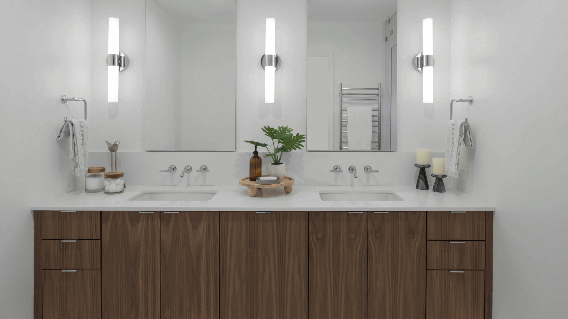 The finished bathroom honors the history of the original home, returning it to more of a mid-century feel while still injecting the family’s personal character. This was accomplished by historically accurate components such as a floating vanity, timeless polished chrome plumbing, white walls and oversized subway tile, small hexagon Carra flooring, and modernized toilet and medicine cabinets with electronic features.