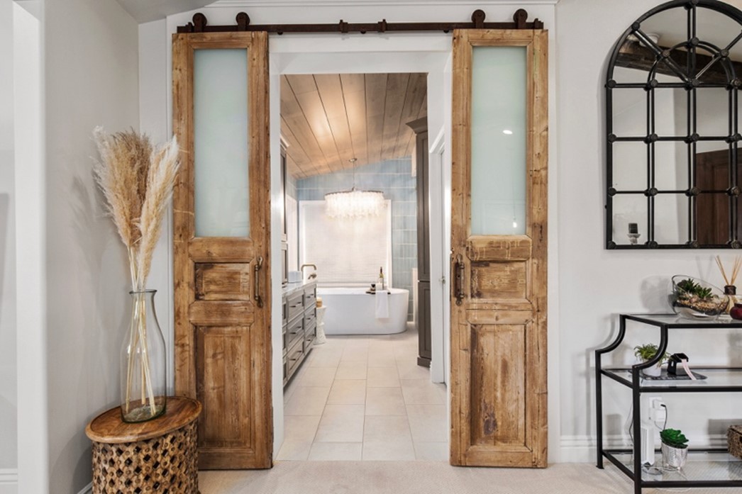 Where there was once an outdated garden tub, Braker brought in a fresh freestanding soaking tub. Without the extra space taken up by the built-in tub tile, she found more room in the shower for a custom bench for the couple to use while steaming in their new steam shower. To balance the sleek modern details, Braker incorporate vintage and classic accents with distinct character, such as the rustic shiplap paneling, brass hardware and reclaimed wood doors.