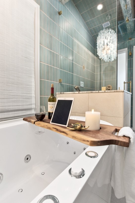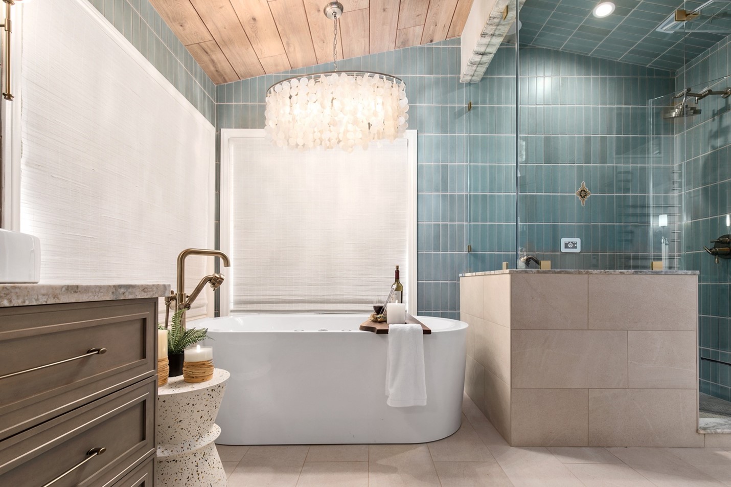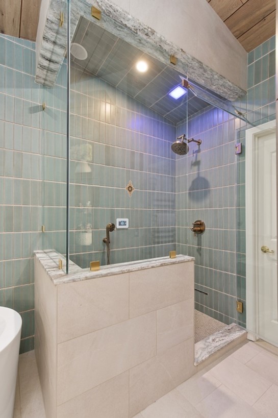 Braker sought to evoke memories of the ocean – and her clients’ favorite vacation spot in Hawaii – with a modern subway tile in a sea blue and with a white chandelier reminiscent of seashells. The blue offers a subtle pop of color against the large sand-colored tiles throughout. Within the enclosed shower, Braker incorporates a smaller neutral tile against the shower floor as well as a unique blue, beige and gray marble in the shower bench and border.